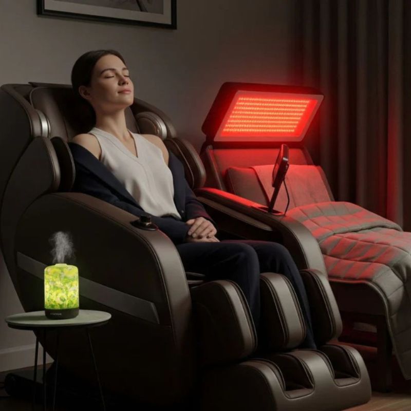 The Cortisol Cleanse Chamber™ combines infrared heat, light therapy, air purification, aromatherapy, and cognitive unloading into one unified system. Your space transforms into a stress-cleansing sanctuary designed for nervous system recovery.