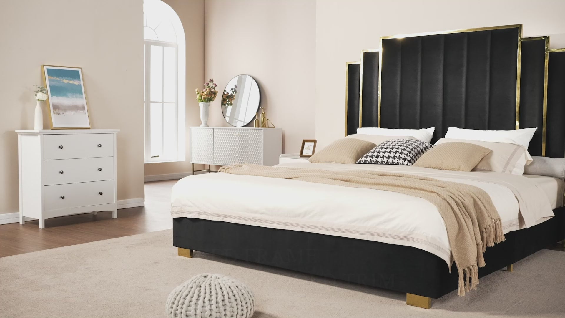 - Modern Style: Soft velvet upholstered side rails flow into vertical channels headboard, supported by gold legs, the king bed frame is contemporary and plush looking.